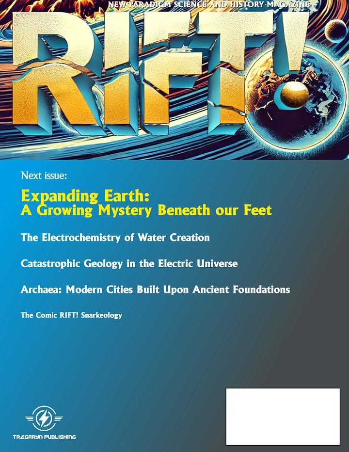 RIFT Magazine is a groundbreaking publication rooted in the New Paradigm, an emerging framework that challenges mainstream views and offers bold new perspectives on the universe and our place within it. We explore theories like the Electric Universe, Expanding Earth, Plasma Cosmology, Catastrophic Geology, and Earth's Lost Advanced Civilization, bringing these revolutionary ideas to life through compelling stories, stunning visuals, and creative storytelling.